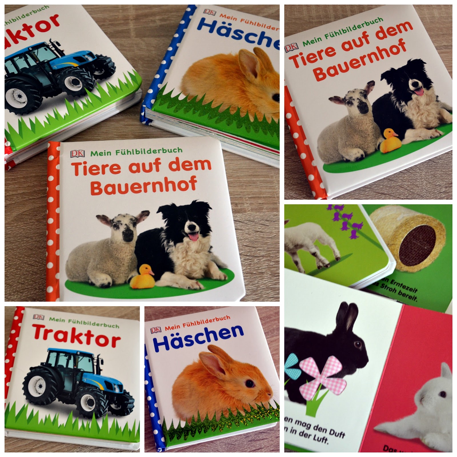 Unsere Fühlbilderbücher „Häschen“, „Traktor“ und „Tiere auf dem Bauernhof“ bleiben eigentlich nie im Haus, wenn wir spazieren gehen oder mit